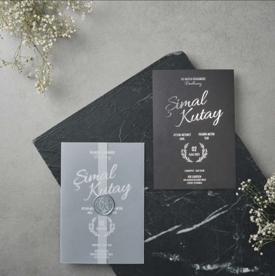 Sıradanlıktan uzak, cesur ve bir o kadar seçkin bir davetiye ile hayatınızın en özel gecesine imza atın. Şimal ve Kutay çiftinin bu unutulmaz başlangıcı için tasarlanan model, siyahın derinliğini gümüşün ışıltısıyla birleştirerek misafirlerinize modern bir görsel şölen sunuyor.